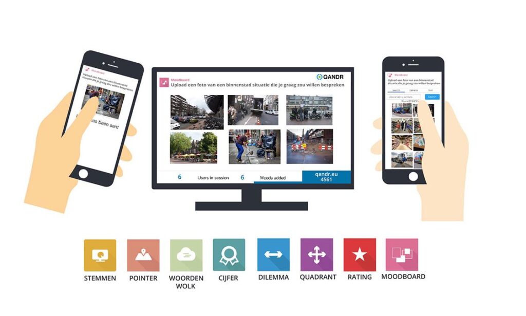 Bij fysiek kwalitatief onderzoek maakten we al veel gebruik van de interactieve tool QANDR. QANDR is een intuïtieve tool waarmee respondenten op een heel visuele manier met elkaar van gedachten kunnen wisselen. Tijdens de groepsdiscussie komt op een groot centraal scherm een serie van vraagstukken voorbij, en we vragen respondenten om via hun telefoon hierop te reageren. De reacties worden live op het scherm geprojecteerd waardoor een overzicht ontstaat van de verschillende invalshoeken en standpunten die respondenten hebben over een onderwerp. Vervolgens zal op basis van deze visuals een discussie plaatsvinden, waarbij respondenten gevraagd wordt hun standpunt te onderbouwen. Het is een intuïtieve, speelse methodiek die aansluit op de meer gevoelsmatige beleveniswereld van respondenten.