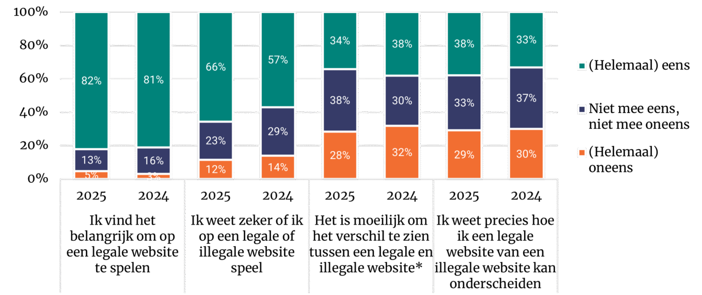 Het grootste deel van de online spelers (82%) vindt het belangrijk om op een legale website te spelen. Ook dit is vergelijkbaar met 2024 (81%). In de praktijk geven online spelers aan te letten op uiteenlopende aspecten bij hun keuze voor een kansspelwebsite. Vier op tien spelers zeggen primair te letten op de betrouwbaarheid van de website (40%) en of het een legale aanbieder betreft (41%). Daarna volgen meer praktische overwegingen, zoals goede reviews (14%), de beschikbaarheid van een specifiek spel (13%), en hoeveel persoonsgegevens er verstrekt moeten worden (12%). Hoewel de betrouwbaarheid en legaliteit van de aanbieder belangrijk gevonden worden, is de meerderheid hier bij het kiezen van een aanbieder dus niet mee bezig. Mogelijk speelt het kunnen maken van onderscheid tussen legale en illegale aanbieders een rol: dit blijkt niet voor iedereen even eenvoudig. Een op drie (33%) geeft aan daar moeite mee te hebben. Wel is een lichte verbetering zichtbaar ten opzichte van 2024: toen had 38 procent hier nog moeite mee. Ook is het aandeel dat zeker weet of ze op een legale of illegale website speelt toegenomen (van 57% naar 65%) en zegt een groter deel te weten hoe ze de twee van elkaar kan onderscheiden (van 33% naar 37%). Factoren die samenhangen met marketing, zoals het ontvangen van een bonus (6%) en het uitkeringspercentage (Return to Player, 4%), hebben volgens spelers een ondergeschikte rol in het keuzeproces.