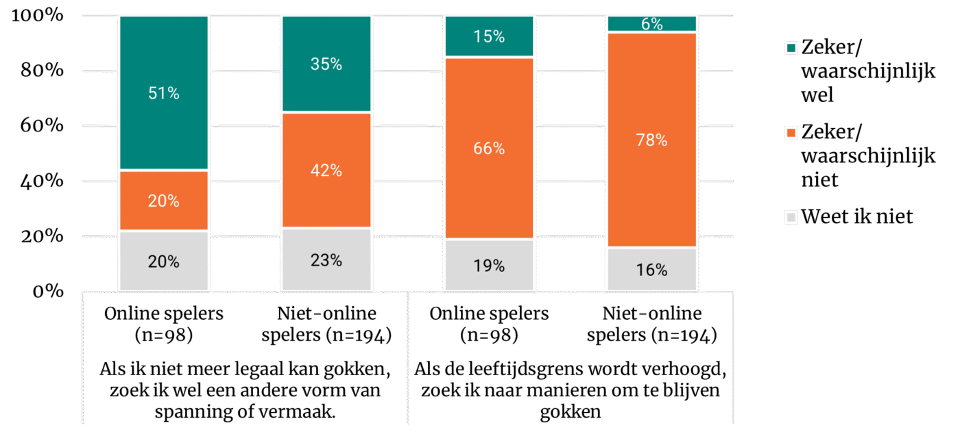 De mogelijkheid bestaat dat een verhoging van de leeftijdsgrens ertoe zou kunnen leiden dat jonge spelers gebruik gaan maken van illegale websites. De meeste jonge spelers van 21 jaar of jonger zeggen dit waarschijnlijk of zeker niet te zullen doen (66% van de online spelers en 78% van de niet-online spelers). Van de online spelers tot 21 jaar zegt ongeveer een op zeven (15%) dat zij mogelijk wel op zoek zullen gaan naar manieren om te blijven gokken als de leeftijdsgrens wordt verhoogd. Voor de niet-online spelers tot 21 jaar gaat het om zes procent. Een grotere groep zegt op zoek te zullen gaan naar een andere vorm van spanning of vermaak als legaal gokken voor hen niet meer mogelijk is (Figuur 2).