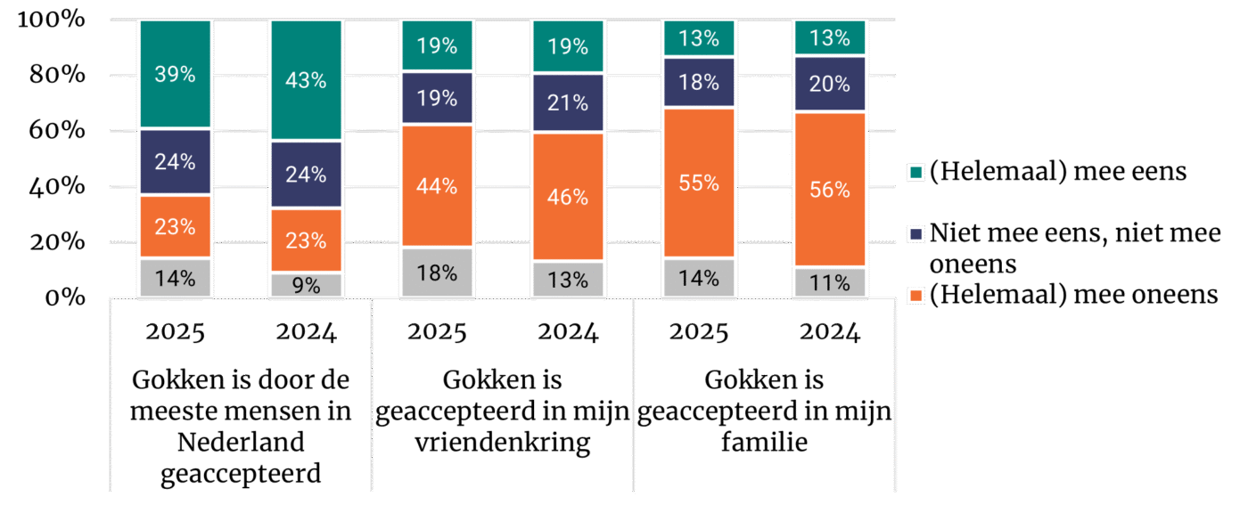 Aan zowel spelers als niet-spelers is gevraagd hoe zij de maatschappelijke acceptatie van gokken beoordelen. Iets minder dan de helft (39%) van de Nederlanders meent dat gokken als maatschappelijk fenomeen wordt geaccepteerd. Dat is minder dan in 2024, toen het 43 procent was. Men denkt dat de eigen familie- of vriendenkring gokken minder accepteert dan gemiddeld in Nederland. De perceptie van de acceptatie in de privé-omgeving (vrienden en familie) is in 2025 niet veranderd ten opzichte van 2024.