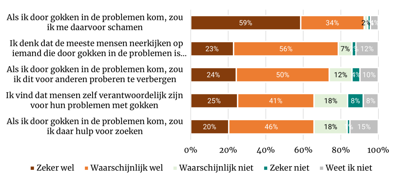 Het overgrote deel van de Nederlanders (93%) is het eens met de stelling dat ze zich zouden schamen als ze door gokken in de problemen zouden komen. Eveneens een ruime meerderheid (79%) denkt dat de meeste mensen neerkijken op iemand die door gokken in de problemen is gekomen en driekwart (74%) zou het voor andere mensen proberen te verbergen als hij of zij door gokken in de problemen zou raken. Onder online spelers speelt schaamte minder dan onder niet-spelers en niet-online spelers (78% tegenover respectievelijk 95% en 92%). Dit taboe lijkt het zoeken van hulp op voorhand niet in de weg te zitten: twee derde van de spelers en niet-spelers (66%) verwacht wel hulp te zoeken als ze in de problemen zouden komen.