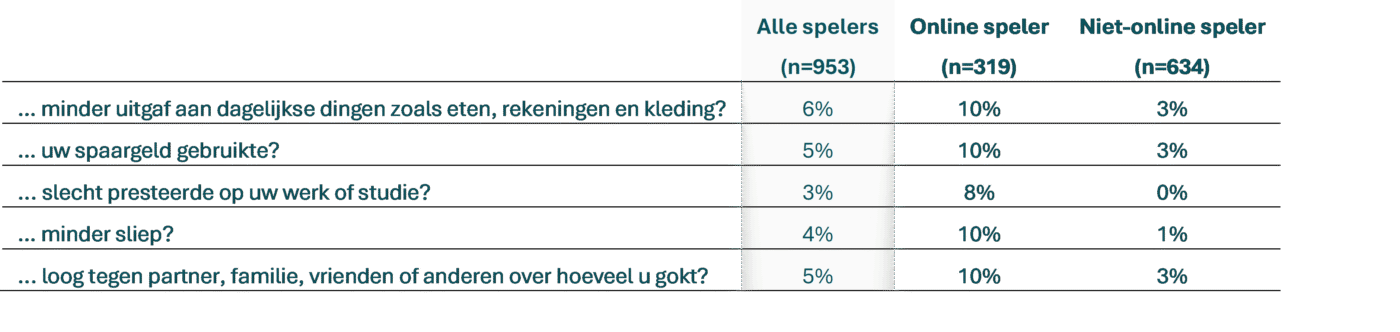 De meeste mensen die in het afgelopen jaar een kansspel speelden, kwamen hierdoor naar eigen zeggen niet in de problemen. Vier procent kreeg wel problemen (1%) of geeft aan daar risico op te lopen (3%). Dat aandeel is vergelijkbaar met de meting van 2024 (5%) . Onder de groep 21 tot en met 23-jarigen ligt dat percentage met 9 procent hoger. Dat geldt ook voor online spelers: binnen die groep rapporteert 9 procent (risico op) problemen. Een deel van de spelers heeft (daarnaast) te maken met negatieve consequenties als gevolg van het gokken. Zo zegt een op twintig spelers (5%) dat ze wel eens spaargeld gebruiken om te gokken, minder slapen of liegen tegen partner, vrienden of familie. Voor alle voorgelegde negatieve consequenties geldt dat online spelers ze vaker rapporteren dan niet-online spelers (Tabel 1).