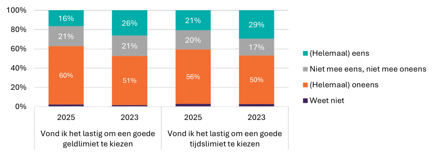 Spelers geven aan over het algemeen beter na te denken over geldlimieten dan over tijdslimieten. Het aandeel spelers dat goed nadacht over het maximale geldbedrag is gestegen van 63 procent in 2023 naar 69 procent in 2025. Voor tijdslimieten blijft dit percentage stabiel op ongeveer de helft (2025: 50%; 2023: 48%). Tegelijkertijd geeft 25 tot 30 procent aan ‘maar iets in te vullen’ om snel te kunnen spelen of bewust een hoge limiet te kiezen om er geen last van te hebben. Uit de interviews komt een aanvullende, pragmatische overweging naar voren: sommige spelers stellen hun limiet bewust net onder een grens in om een verplicht contactmoment met de aanbieder te vermijden.