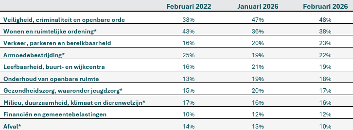 Ten opzichte van vier jaar geleden zijn veiligheid (van 38 naar 48%), verkeer (van 16 naar 23%) en onderhoud openbare ruimte (van 13 naar 18%) belangrijker geworden.