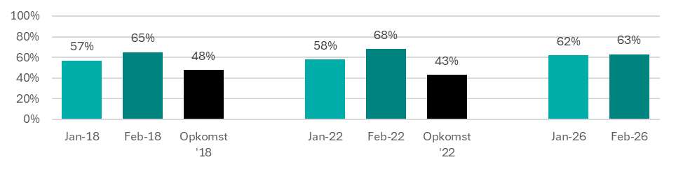 Figuur 2: Percentage dat aangeeft ‘zeker’ te gaan stemmen en opkomst in 2018, 2022 en 2026