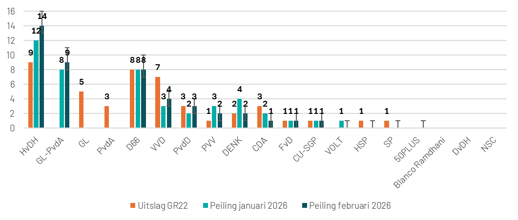 Balken geven marges aan van twee zetels bij grote partijen (Hart voor Den Haag, D66 en GroenLinks-PvdA) en één zetel bij andere partijen.