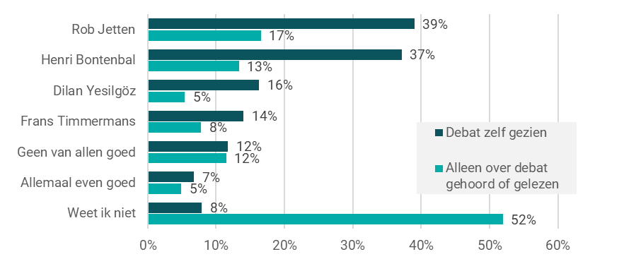 Acht op de tien (82%) D66-kiezers die keken noemen Jetten als meest overtuigend. Opvallend is dat GL-PvdA- kiezers net zo vaak Jetten de beste vinden als Timmermans (beide 52%). Ook CDA- en VVD-kiezers vonden Jetten vaak de beste (beide 37%). VVD-kiezers kiezen bijna net zo vaak voor Jetten als voor Yesilgöz.