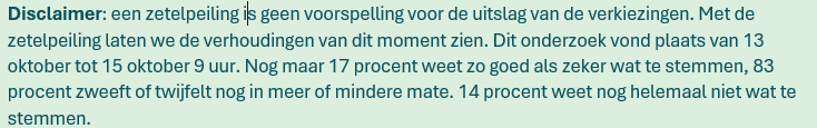 Bij de zetelpeilingen in aanloop naar de verkiezingen maken we gebruik van een zogeheten rolling panel. Dit houdt in dat respondenten die deelnamen aan de vorige peiling, ook voor de nieuwe peiling worden uitgenodigd. Op die manier kunnen we meten welke kiezersstromen plaatsvinden en welke redenen kiezers hebben om van partijvoorkeur te veranderen. Aan deze peiling namen 1.076 respondenten deel die ook deelnamen aan de peiling van vorige week.