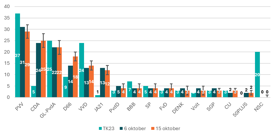 In de zetelpeiling van 15 oktober blijft de PVV de grootste partij, nu met 29 virtuele zetels (was vorige week 31, geen significant verschil). Daarna volgen CDA (van 24 naar 25) en GL-PvdA (blijft op 22). D66 is de afgelopen weken in opkomst. De sociaalliberalen schommelden begin dit jaar lang rond de 10 en 12 zetels, klommen de laatste weken naar zo’n 14 zetels en groeien nu door naar 18 virtuele zetels. In vergelijking met de huidige zetelverdeling in de Kamer (9 zetels) zou dat een verdubbeling betekenen.