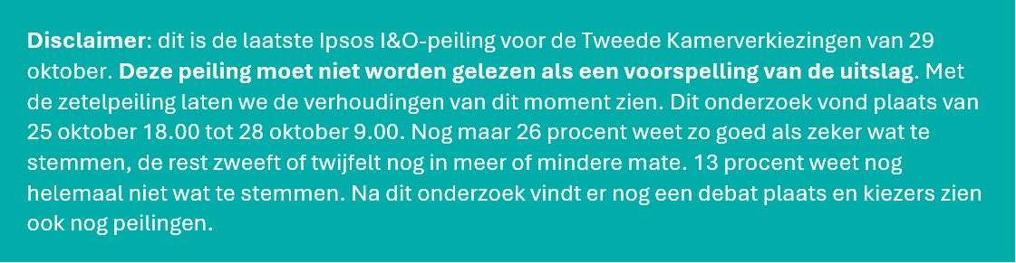 In de Ipsos I&O-zetelpeiling van 28 oktober 2025 komen drie partijen uit op 23 virtuele zetels: D66, GL-PvdA en PVV. Vlak daarna volgen CDA (19) en VVD (17). De enige significante verandering die optreedt sinds afgelopen weekend is dat de PVV wederom drie virtuele zetels inlevert. Er zijn nu vijf partijen die in theorie allemaal nog de grootste kunnen worden.