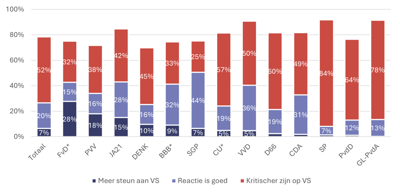 De Nederlandse regering reageerde terughoudend op de Amerikaanse acties in Venezuela, begin januari. Veel Nederlanders hadden liever een kritischer reactie gezien (52%). Eén op de vijf (20%) vindt de regeringsreactie adequaat – met name kiezers van SGP (44%), VVD (36%), BBB (32%) en CDA (31%). Een kleine groep (7%) vindt dat Nederland meer steun aan de VS moet bieden, de rest heeft er geen uitgesproken mening over.