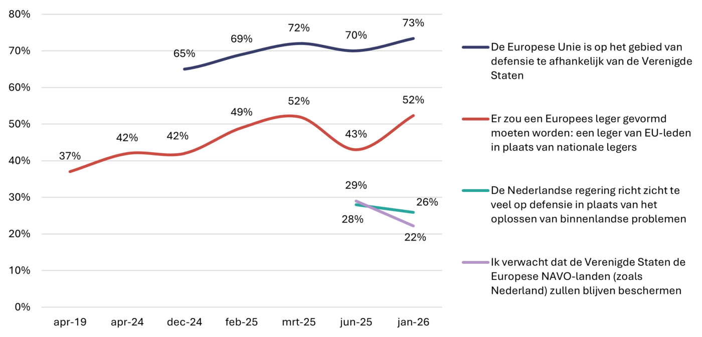 Wel lijken de Amerikaanse acties en plannen de urgentie van Europese samenwerking op het gebied van defensie aan te wakkeren. Bijna driekwart (73%) vindt de EU te afhankelijk van de VS op defensiegebied. Dit aandeel nam de afgelopen tijd toe, in december 2024 was 65 procent deze mening toegedaan. Ook verwacht nu nog maar 22 procent dat de VS de Europese NAVO-landen zullen blijven beschermen (was 29% in juni 2025).