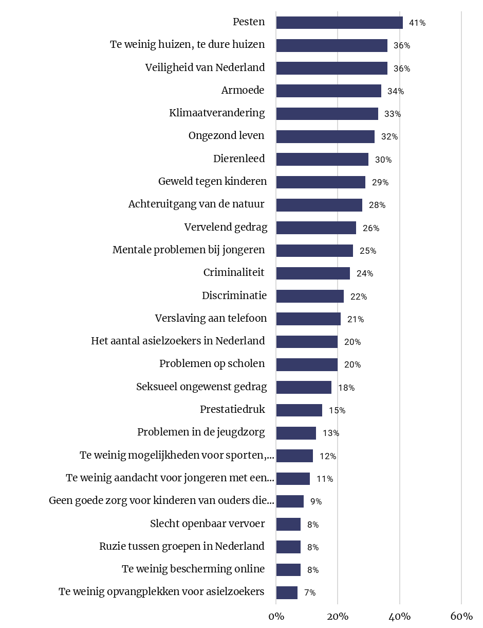 Van de voorgelegde onderwerpen zijn pesten (41%), te weinig en te dure huizen (36%) en de veiligheid van Nederland (39%) de onderwerpen die jongeren het meest belangrijk vinden. Er zijn verschillen te zien tussen verschillende leeftijdsgroepen. Pesten staat bij de jongere groep (10 t/m 15 jaar) bovenaan in de top 3, terwijl dit voor oudere jongeren (16 t/m 17 jaar) buiten de top 3 valt. Bij de 16- en 17-jarigen staat het huizentekort op de eerste plaats, gevolgd door mentale problemen bij jongeren. De thema’s veiligheid en huizentekort vallen juist in de jongste leeftijdsgroep (10 t/m 12 jaar) buiten de top 3. In deze leeftijdsgroep staat dierenleed op de tweede plaats en armoede op de derde plaats.