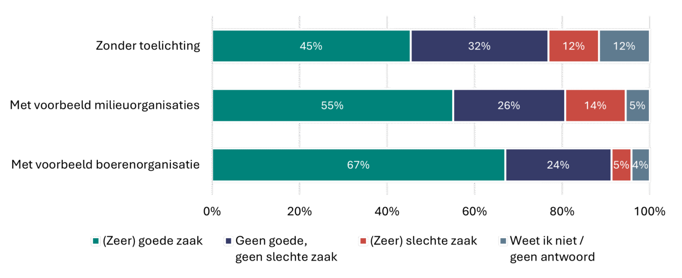 Respondenten kregen de vraag voorgelegd zonder toelichting (n=1.047), met een voorbeeld van milieuorganisaties (n=515) of met een voorbeeld van boerenorganisaties (n=532).