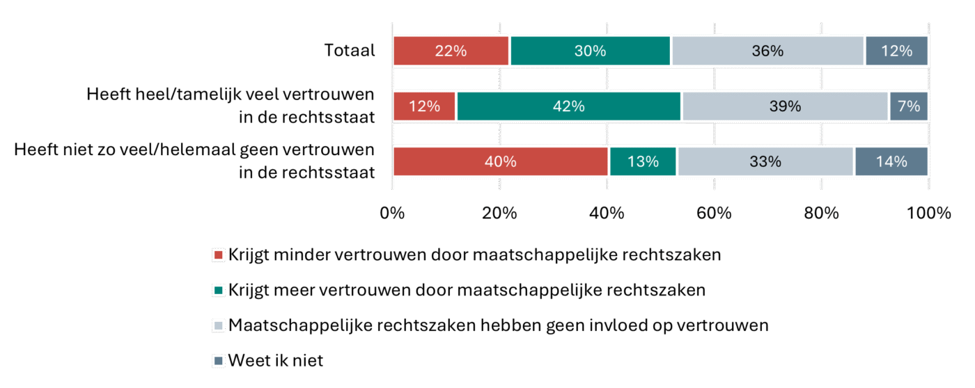 Of maatschappelijke rechtszaken bij Nederlanders zorgen voor meer of minder vertrouwen in een goed werkende rechtsstaat, hangt af van hoeveel vertrouwen iemand al heeft. Maatschappelijke rechtszaken versterken vaak het vertrouwen bij mensen die al vertrouwen hebben in de rechtsstaat, terwijl ze bij sceptici eerder leiden tot een verdere vermindering van dat vertrouwen.