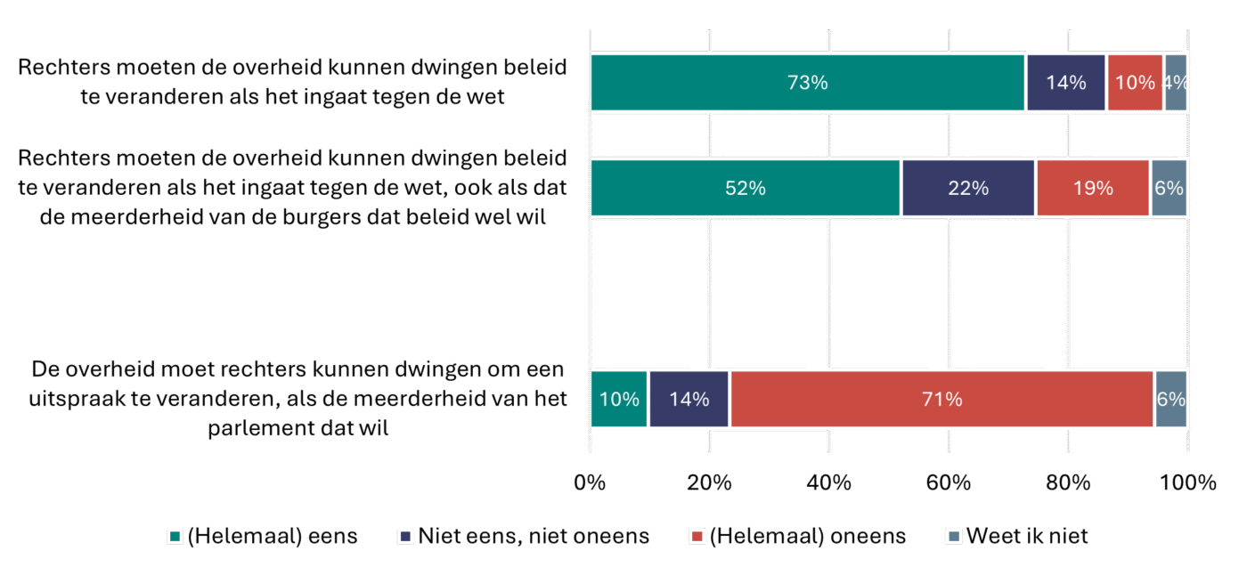 Driekwart van de Nederlanders (73%) vindt dat rechters de overheid moeten kunnen dwingen om onwettelijk beleid aan te passen. Ook als dit ingaat tegen ‘wat de meerderheid van de burgers wil’, vindt de meerderheid (52%) dat de rechter zich over dit beleid moet kunnen uitspreken. Andersom zien veruit de meesten (71%) het niet zitten dat de overheid rechters moet kunnen dwingen hun uitspraken te veranderen (10% wil dat wel).