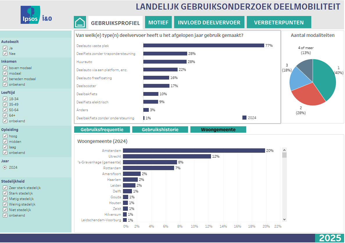 In opdracht van het programma Natuurlijk!Deelmobiliteit heeft Ipsos I&O in het najaar van 2024 het eerste Landelijk Gebruikersonderzoek Deelmobiliteit uitgevoerd. Dit onderzoek centraliseert onderzoek naar deelvervoer in Nederland en geeft antwoord op de vraag: Wie gebruiken deelvervoer in Nederland?
